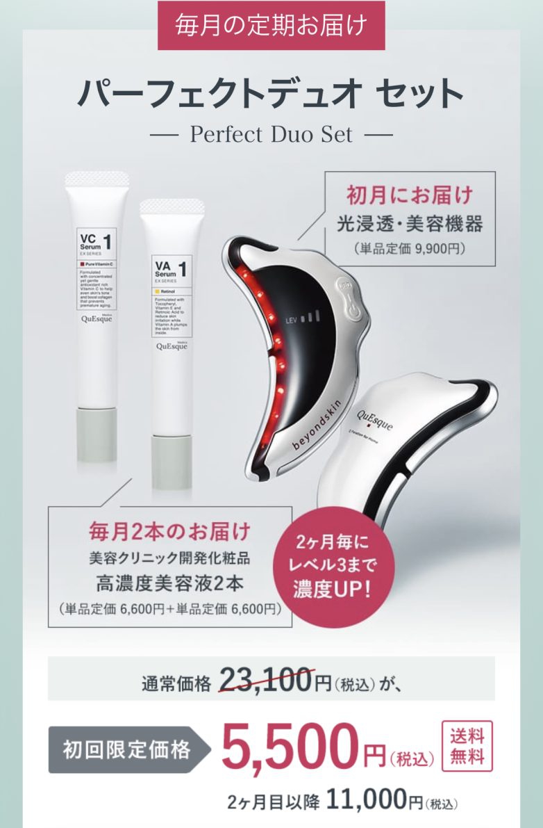 そんな女性にもおすすめなのが「クエスク・メディクス」のパーフェクトデュオ セット。 クリニック開発の美顔器「ビヨンドスキン」とレチノール、ビタミンCの高濃度美容液のセットです。